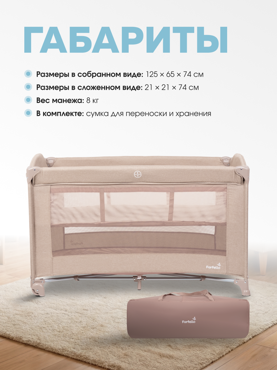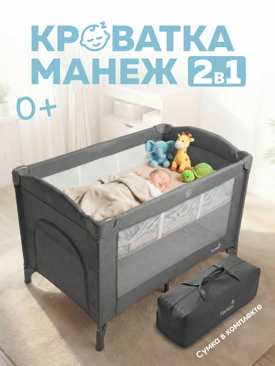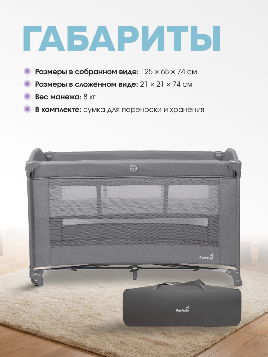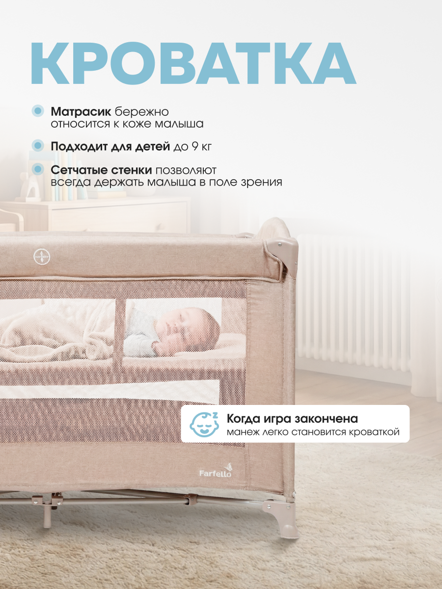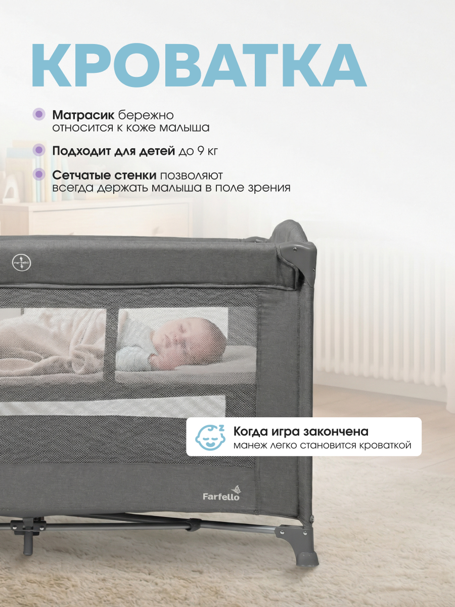 Манеж-кроватка Farfello — это не просто спальное место, а надёжное «личное пространство» малыша, где он может спать, играть и расти в безопасности.