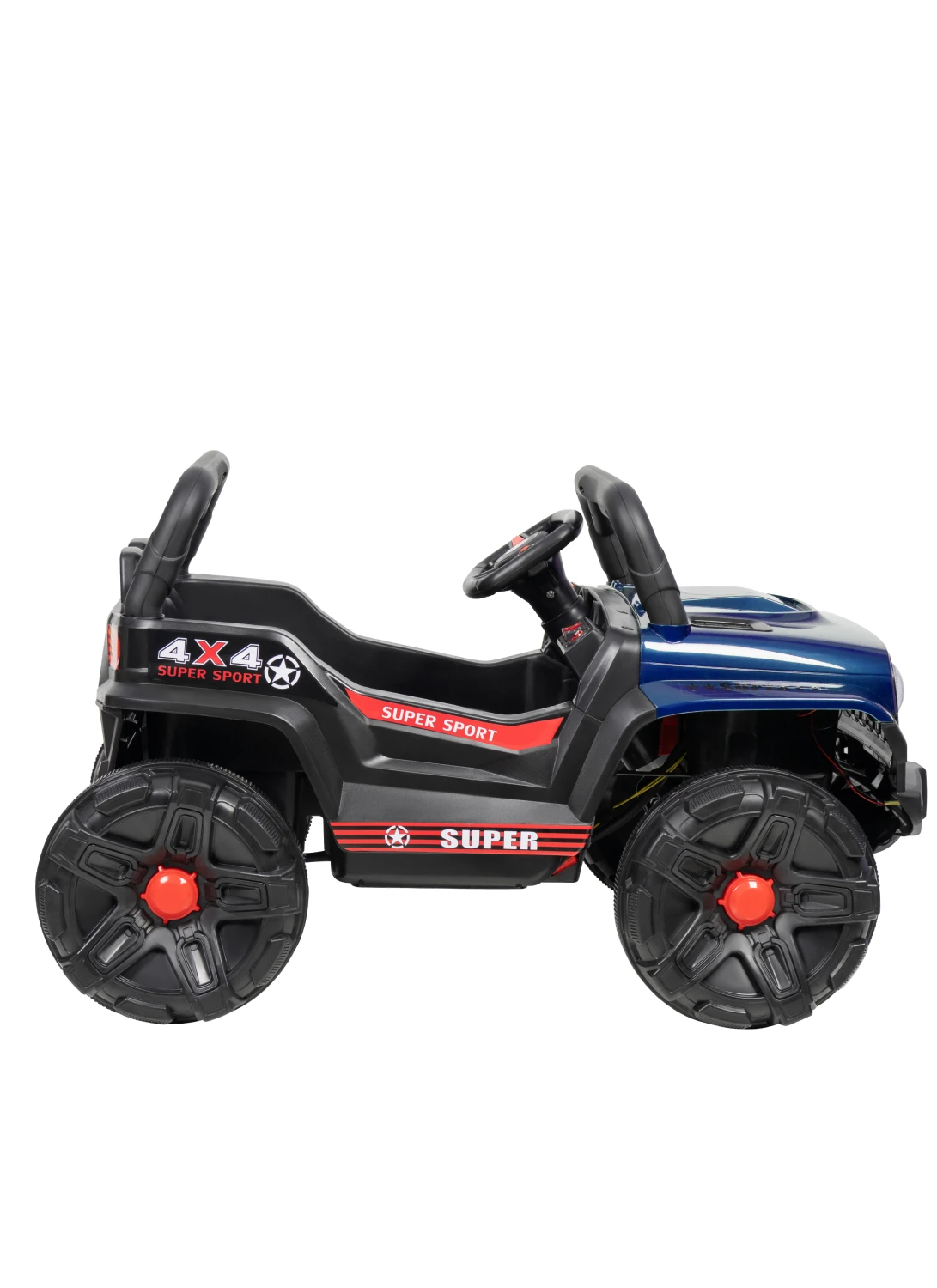 Машина работает от аккумулятора. Ребенок сам управляет электромобилем педалью газа и рулем. Также предусмотрен пульт дистанционного управления для родителей. Для безопасности есть поясной ремень безопасности. Широкая колесная база машины устойчива и надежна.