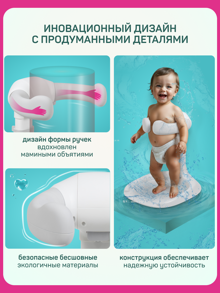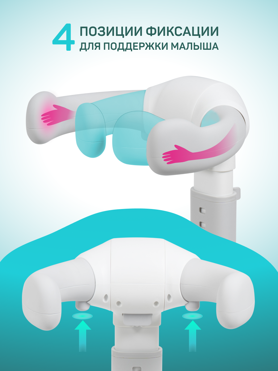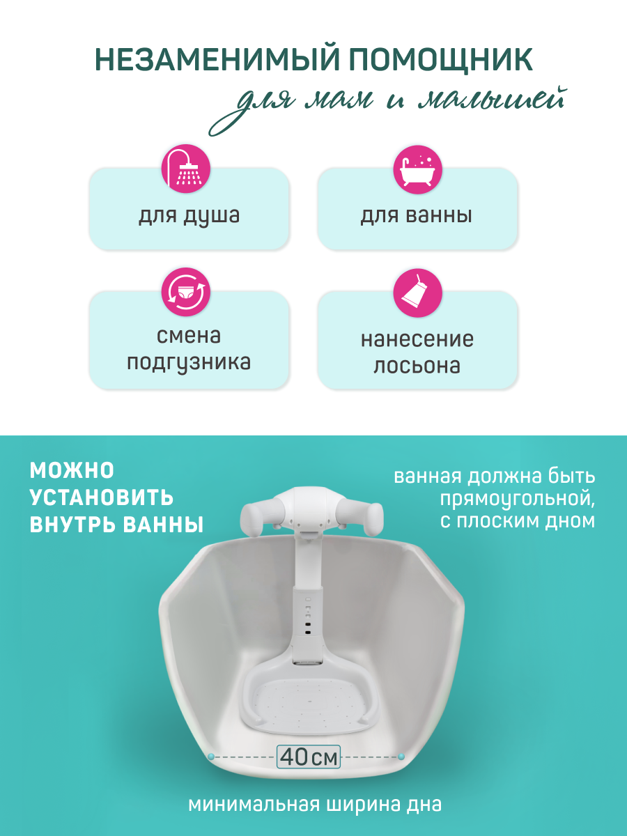 Благодаря продуманному дизайну можно не беспокоиться о том, что вода попадет в уши или ребенок захлебнется водой. С помощью данной стойки можно не только купать ребенка, её также можно использовать для смены подгузника, умывания, нанесения лосьона на тело малыша. Ребенок сможет практиковать стояние и укреплять свои мышцы. Форма детской ванночки обеспечивает поддержку, приближенную к маминым объятиям, что делает купание максимально расслабляющим.