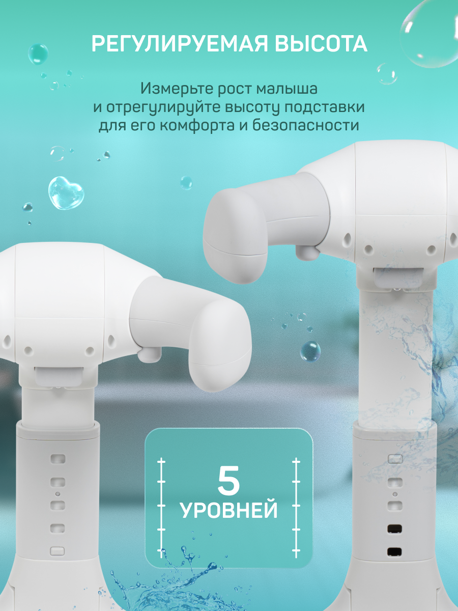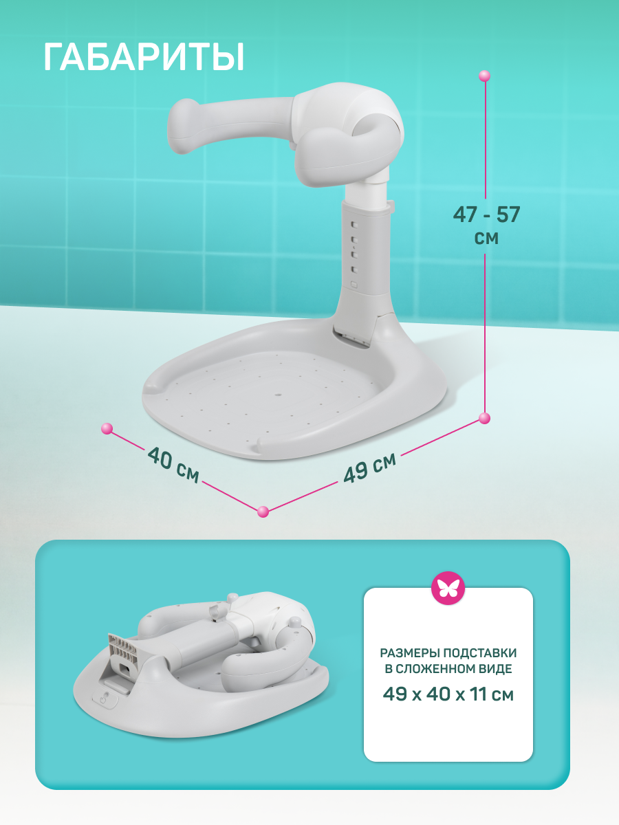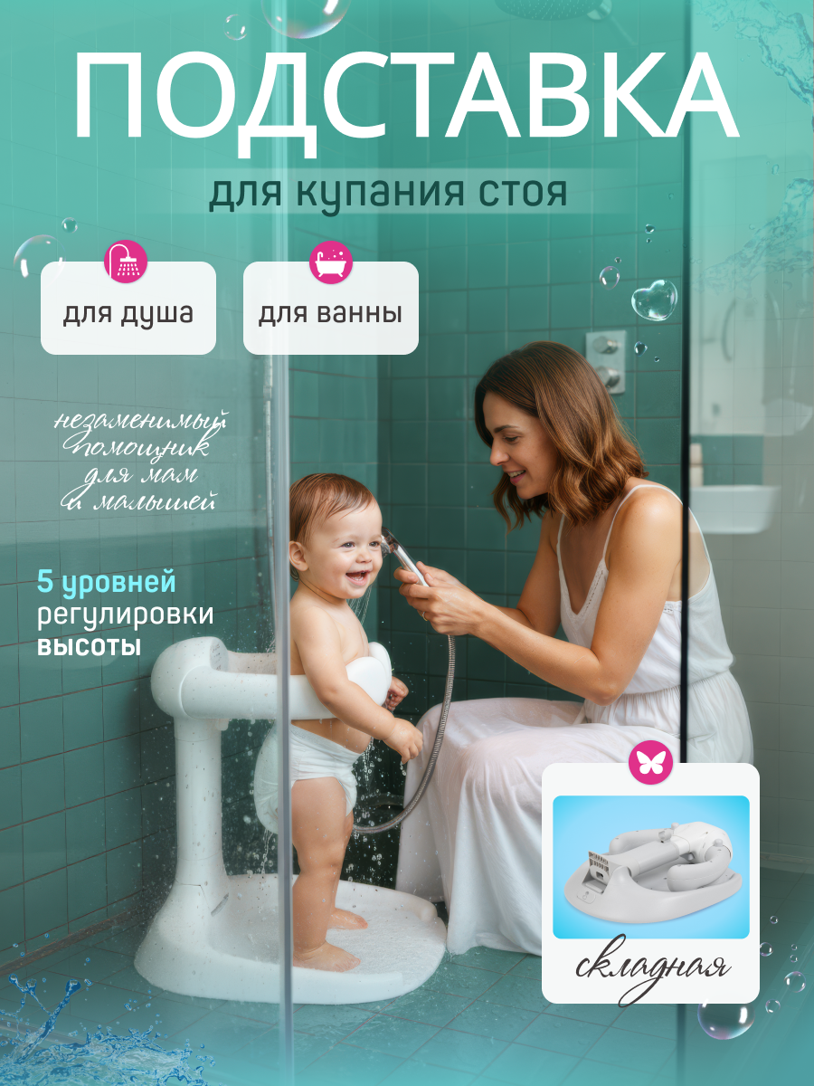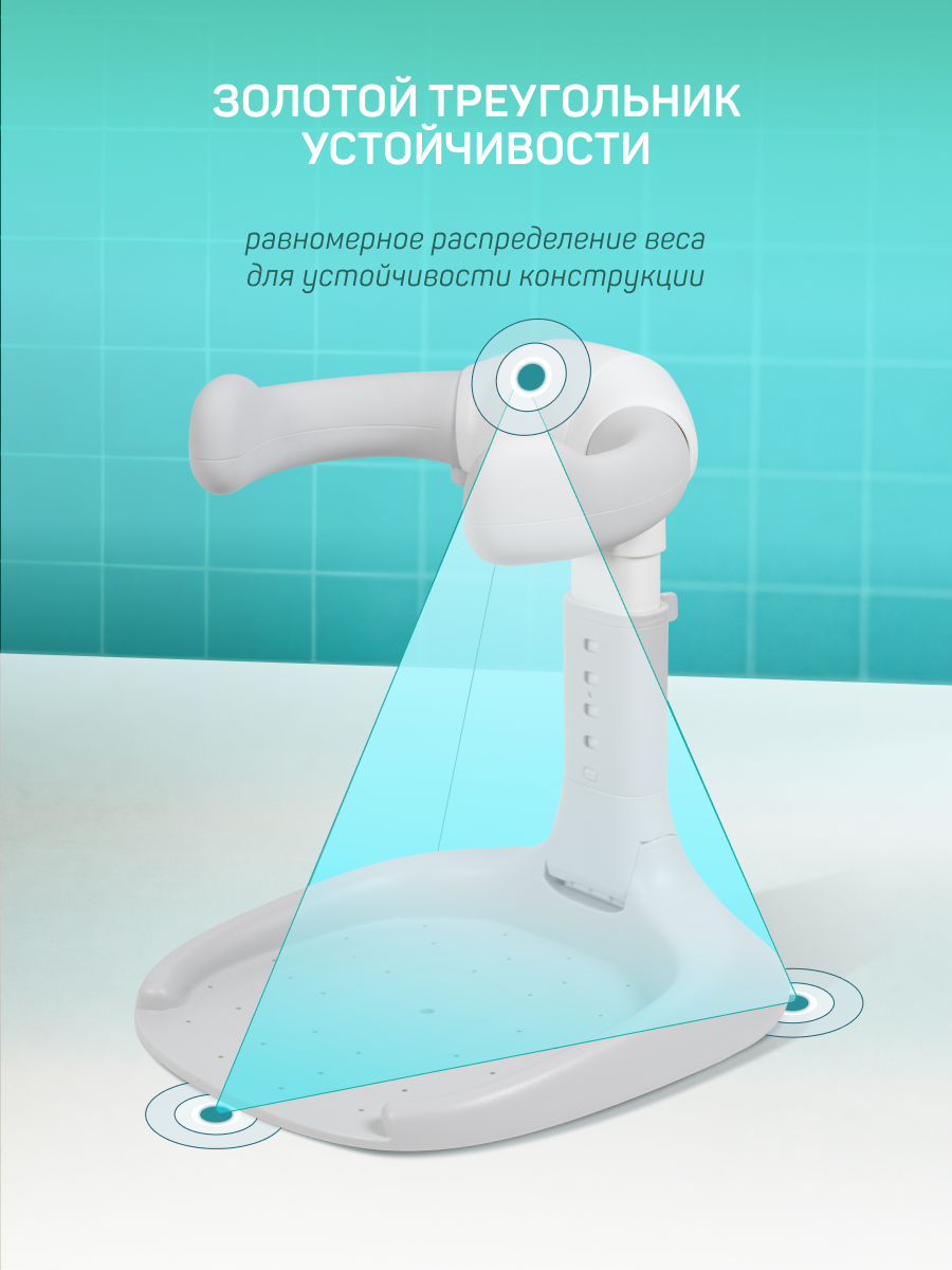 Благодаря продуманному дизайну можно не беспокоиться о том, что вода попадет в уши или ребенок захлебнется водой. С помощью данной стойки можно не только купать ребенка, её также можно использовать для смены подгузника, умывания, нанесения лосьона на тело малыша. Ребенок сможет практиковать стояние и укреплять свои мышцы. Форма детской ванночки обеспечивает поддержку, приближенную к маминым объятиям, что делает купание максимально расслабляющим.