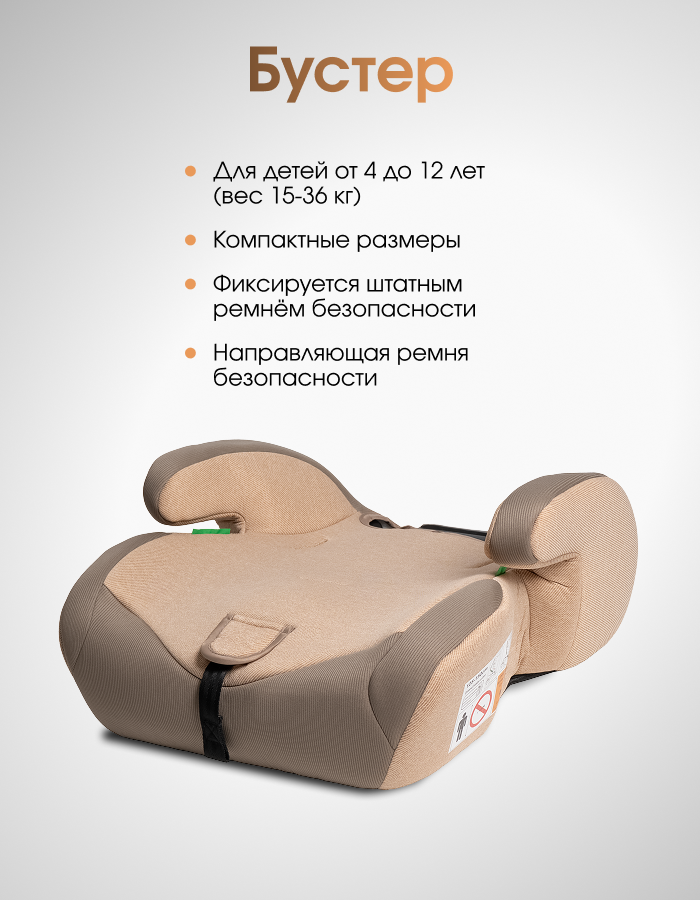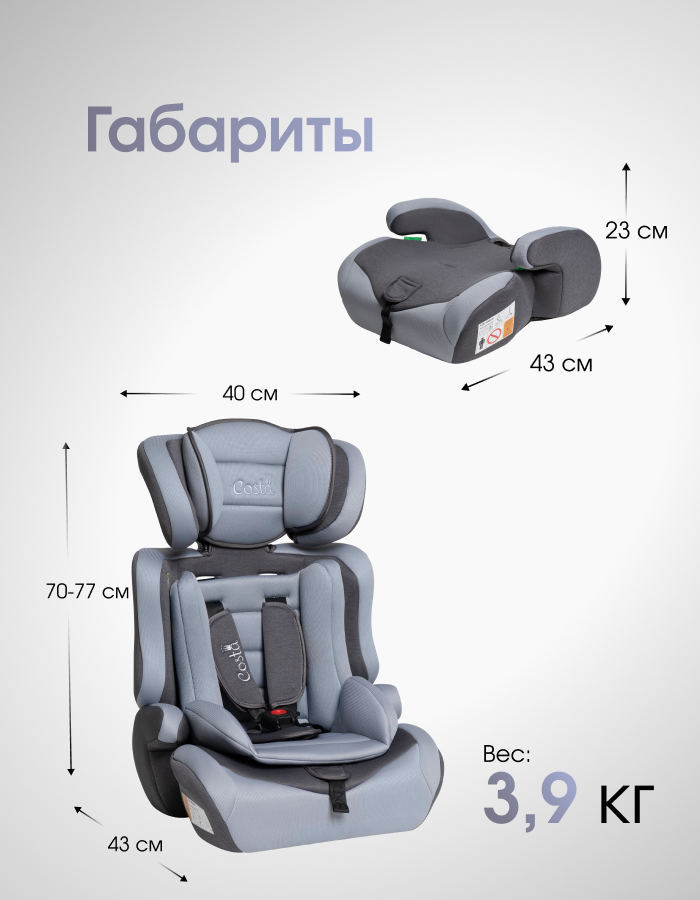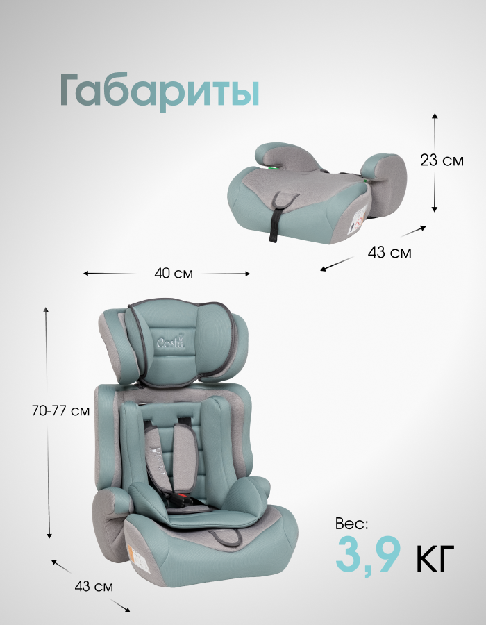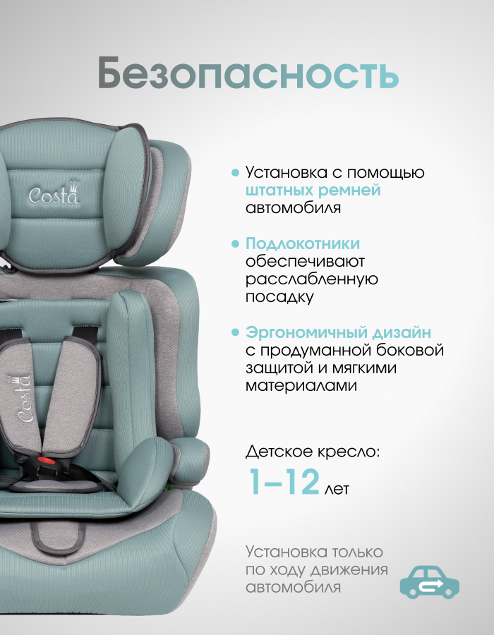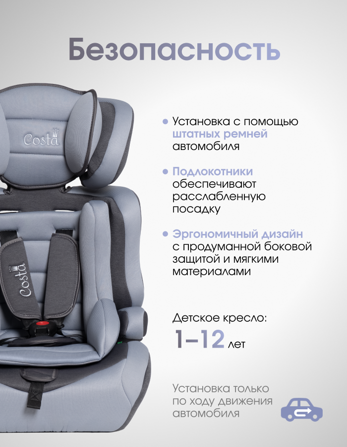 Крепится в автомобиле с помощью штатных ремней безопасности и устанавливается по ходу движения автомобиля.