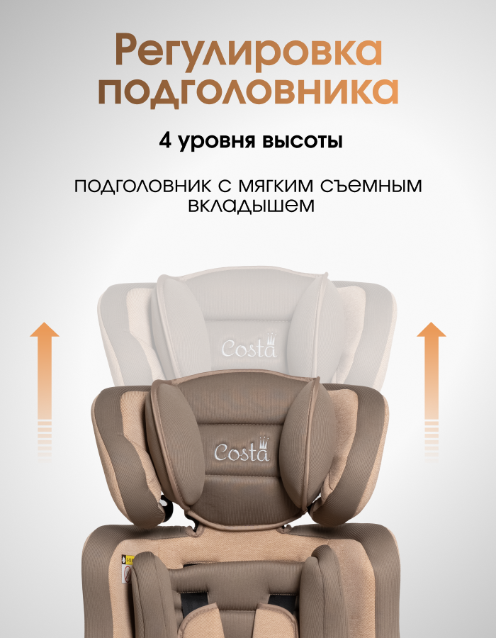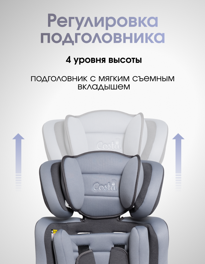 • регулируемый по высоте подголовник (4 уровня высоты) с мягким съемным вкладышем.