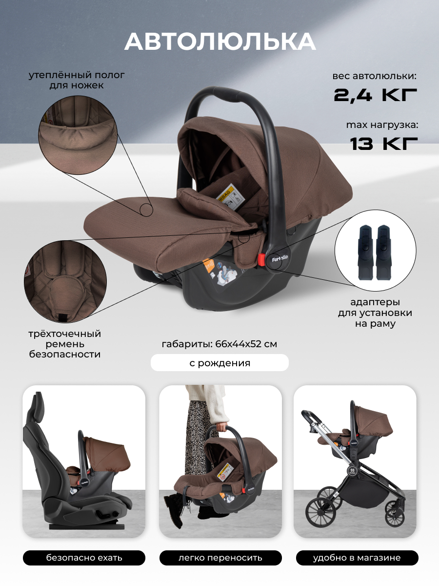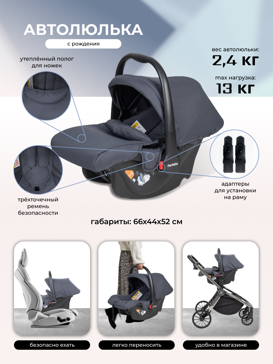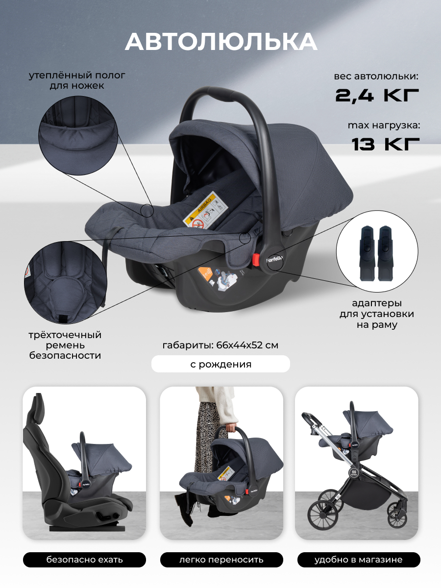 Автолюлька (0-13 кг) имеет трехточечные ремни безопасности с мягкими накладками. Имеет собственный полог для ног. Устанавливается на раму коляски. В машине крепится штатными ремнями против хода движения.