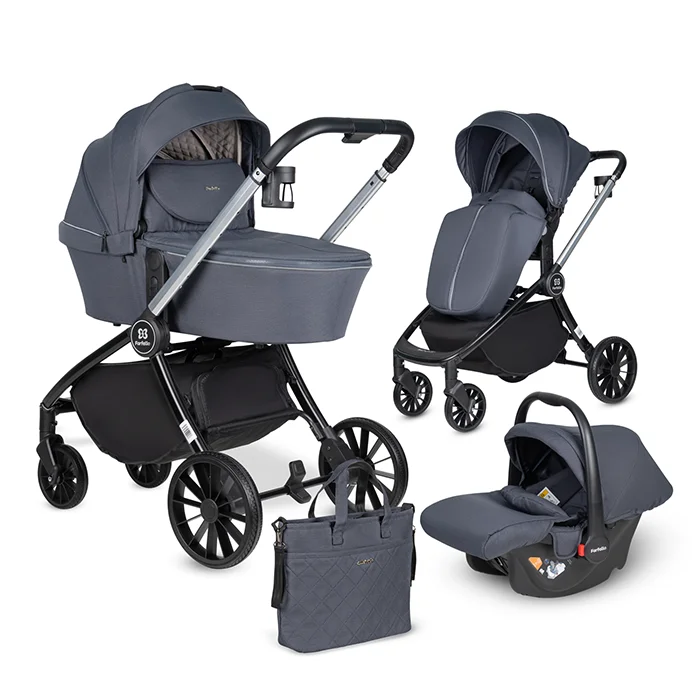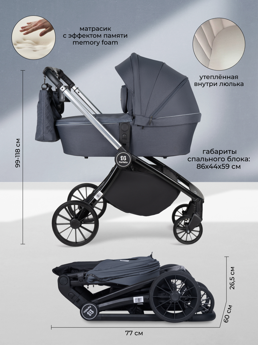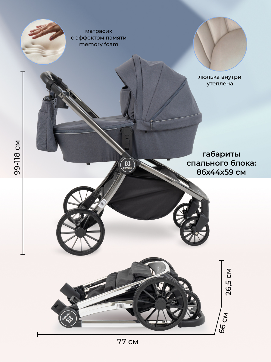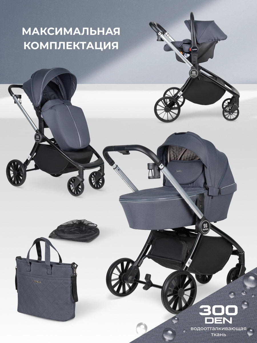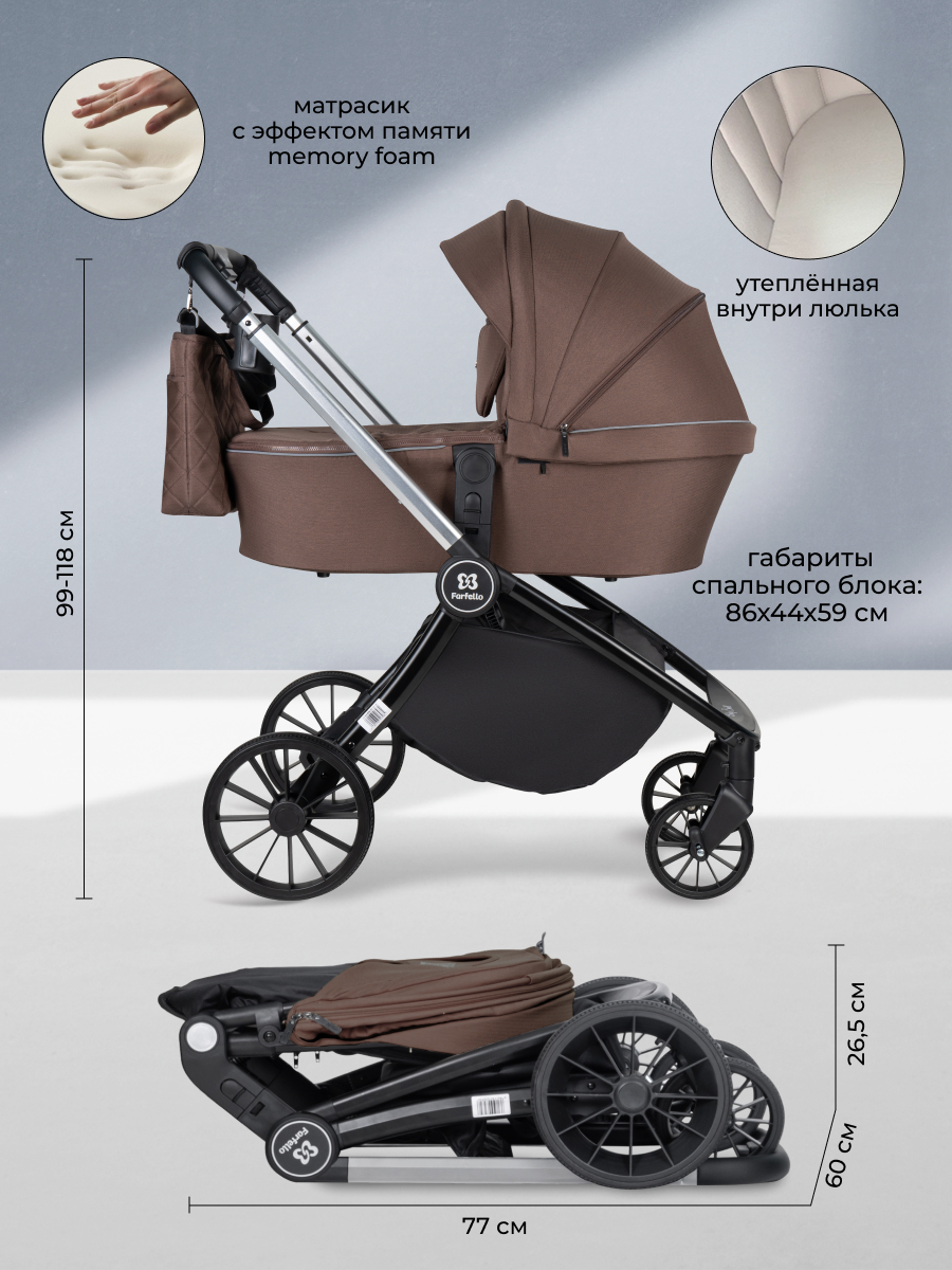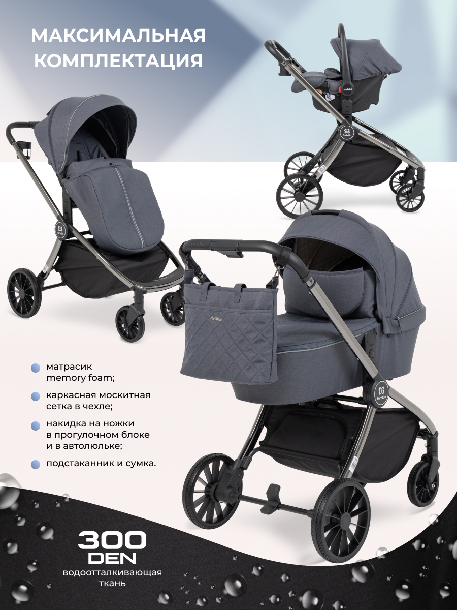 В комплекте: матрасик memory foam, сумка, каркасная москитная сетка в чехле, подстаканник, накидка на ножки в прогулочном блоке и в автолюльке.