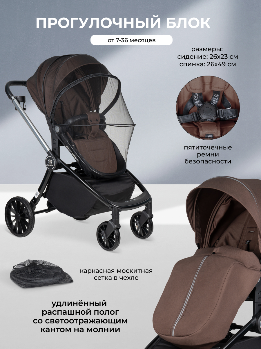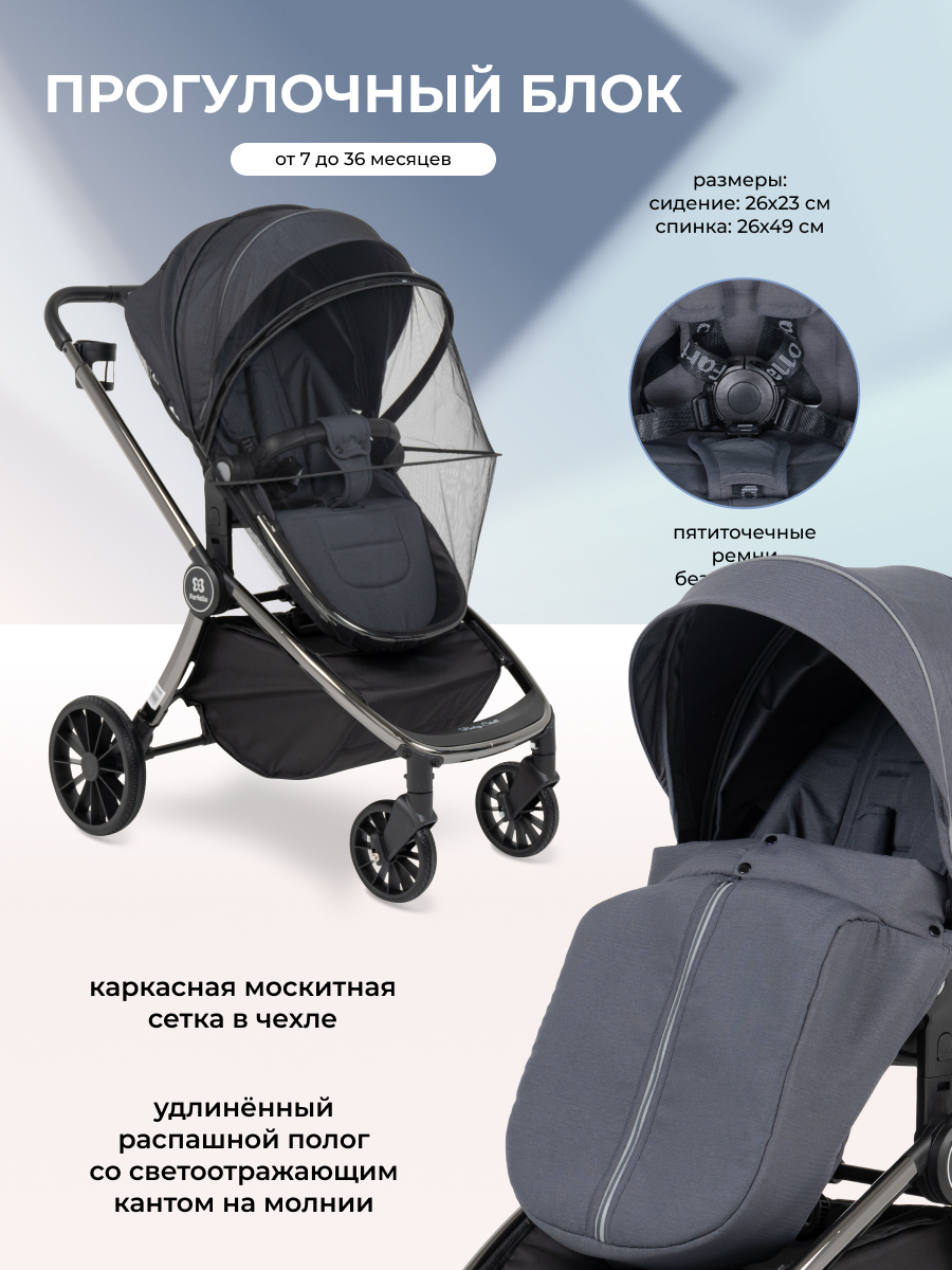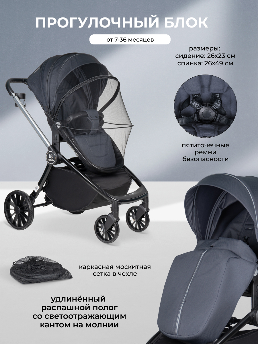 Прогулочный блок (с 7 до 36 мес): 3 положения регулировки угла наклона спинки при помощи кнопки. Для безопасности предусмотрены пятиточечные ремни безопасности, разделитель для ног и съемный бампер. Прогулочный блок имеет глубокий трехсекционный капюшон со скрытым окошком для вентиляции.