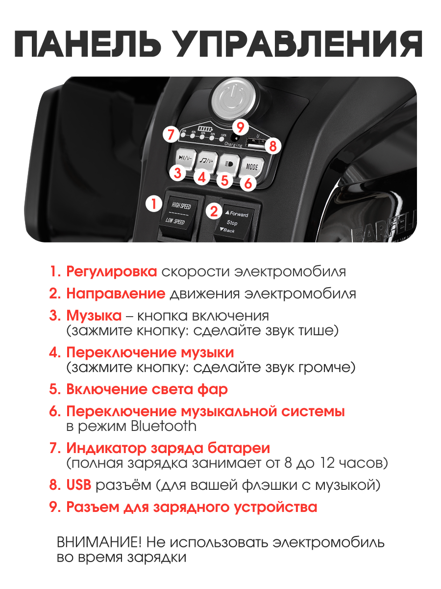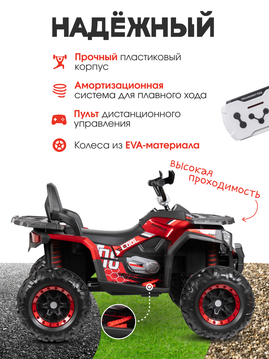 Стильный электромобиль квадроцикл Farfello TR124 создан для маленьких водителей, которые мечтают почувствовать себя настоящими автолюбителями. Прочная конструкция и продуманная система управления обеспечат безопасное и увлекательное катание.