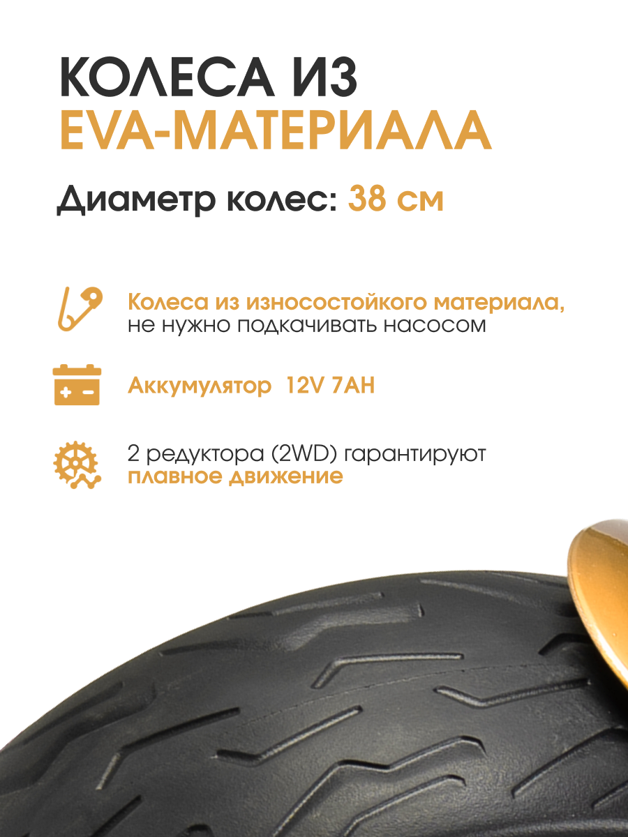 • Колёса из EVA-материала диаметром 38 см — бесшумные, подходят для разных типов поверхности.