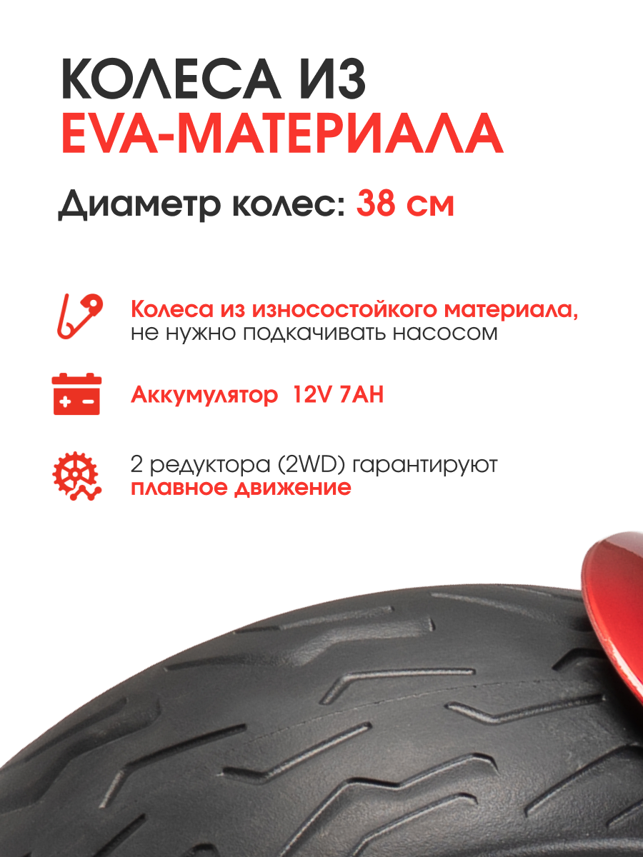 • Аккумулятор 12V 7AH и 2 мощных редуктора обеспечивают плавный старт и хорошую проходимость.