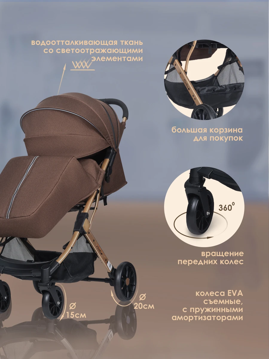 В комплекте: распашной полог для ног со светоотражающими вставками, москитная сетка и сумка-чехол для коляски.