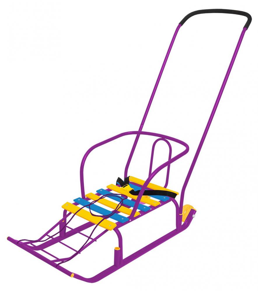 Материал: каркас – металл; сидение – деревянные рейки; ремень безопасности – ременная лента; колеса – морозостойкая пластмасса