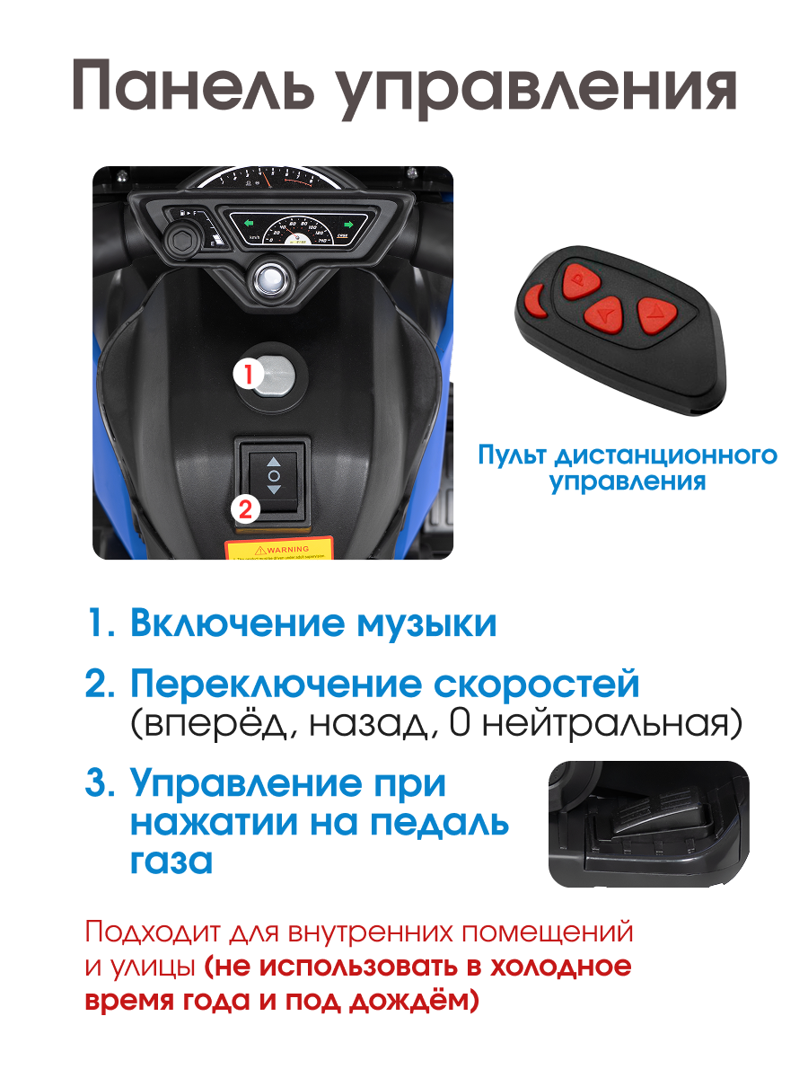 ∙ Простое управление: малыш нажимает кнопку, жмёт на педаль — и вперёд. Но если он ещё не готов, всё сделаете вы с пульта.