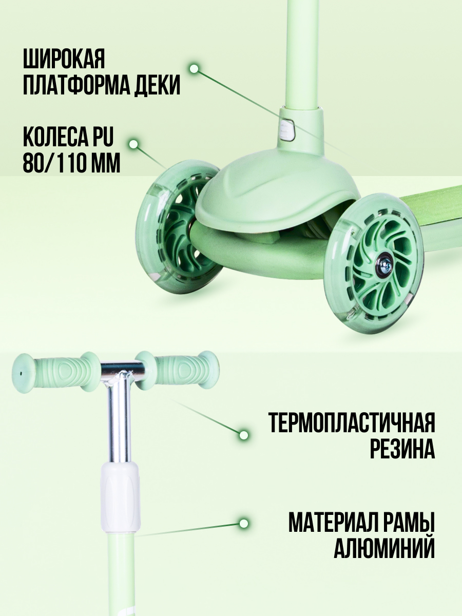 Cамокат меняет направление за счет наклона рукоятки в нужную сторону. Широкая платформа позволит ребёнку поставить обе ноги на самокат.